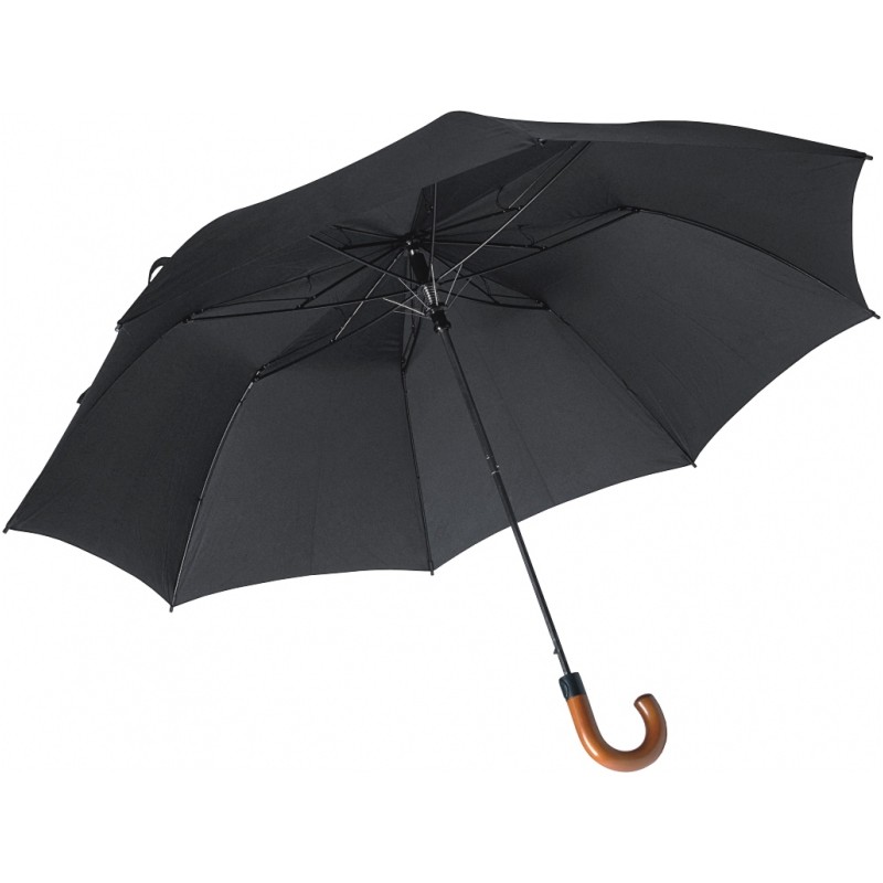Skládací golfový deštník s dvoudílnou konstrukcí, dřevěná zahnutá rukojeť, obal s popruhem přes rameno, automatické otvírání, černé provedení potahu. Minimální objednávka 12 kusů.